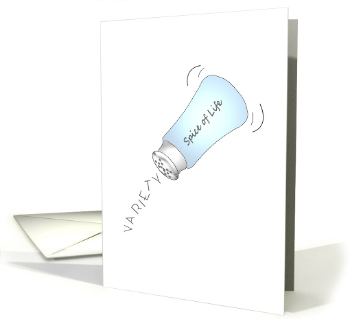 This fun design is an illustration of the idiom 'variety is the spice of life'. The word 'variety' is being shaken out of a spice pot.