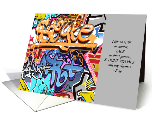Colorful style and art graffiti wall with an inspirational quite by bay area rap artist E-40, I like to rap in cursive, talk in third person, and paint visuals with my rhymes. Send as an enouragement card for someone that has their own unorthodox ways telling them to keep on being them-self, an innovator, trail blazer and they will succeed.