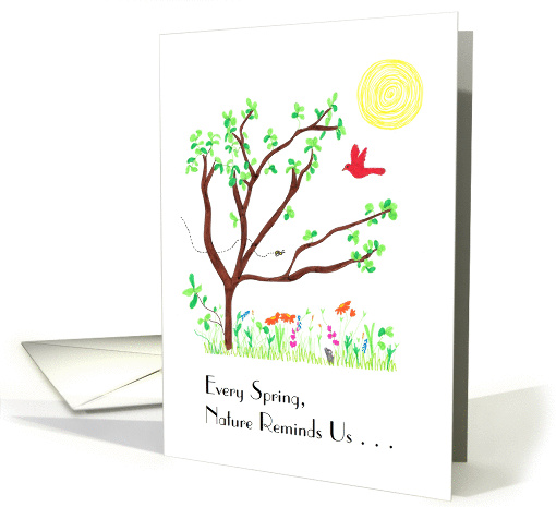 A gentle and colorful nature scene depicts a tree budding new leaves, a red bird flying, a bee buzzing, a small grey mouse peeping out from grasses, and a variety of fresh flowers with blue, orange and pink blossoms. The front reads, 'Every Spring, Nature Reminds Us . . .' in an elegant retro Parisian font. The inside reads ' . . . that we can all enjoy a fresh start!'