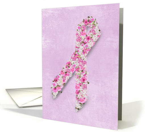 Pink and white floral breast cancer awareness ribbon symbol on textured background.