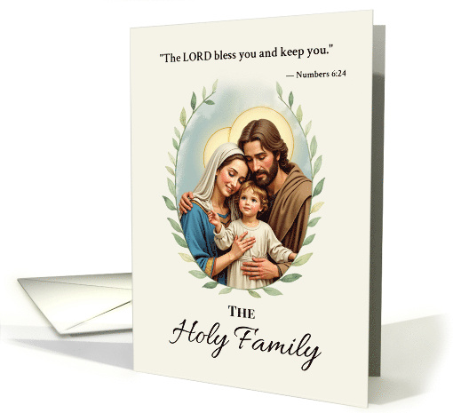 This peaceful devotional design features a tender illustration of the Holy Family—Mary, Joseph, and young Jesus—framed by a soft botanical wreath and bathed in gentle light. The blessing from Numbers 6:24 ("The LORD bless you and keep you") appears at the top, making it a thoughtful way to uplift someone in faith, offer encouragement, or share spiritual support throughout the year. Suitable for a variety of occasions or simply to send a note of warmth, prayer, and love.