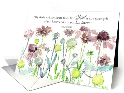 Christian encouragement greetings for friends, relatives, church Bible study groups featuring a scripture from the book of Psalms 73:26 and decorated with wispy wildflowers from the summer garden hand drawn with soft grey ink and painted with watercolor.