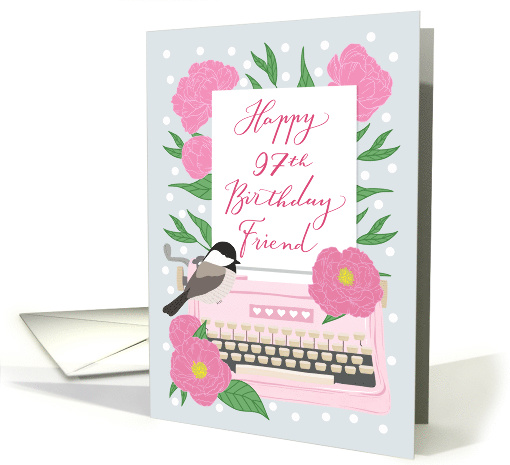 A pink vintage typewriter surrounded by flowers and leaves with a chickadee bird perched on the typewriter. A piece of paper from the typewriter has the handwritten words Happy 97th Birthday Friend. A lovely birthday card for your friend turning 97!