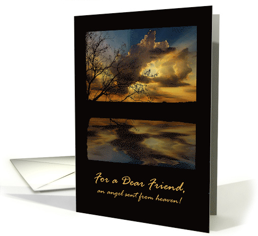 Birthday greetings for a friend. Drama-filled digital painting with a lake/water theme and sunset with clouds parting to reveal a hole of light.