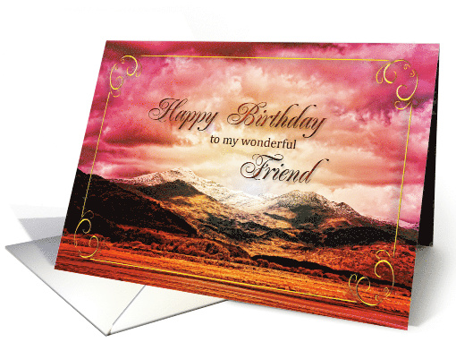 Birthday card for Friend with a glorious sunset. The sun is setting behind the mountains with wonderful colors. The view is of Snowdonia in Wales. A wonderful scene to give a smile on his birthday.