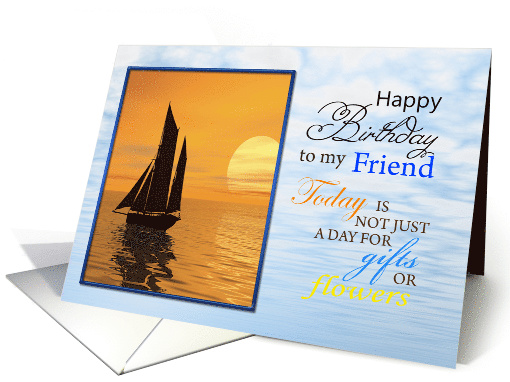 A birthday card to say how great your friend is! A yacht sailing on a tranquil sea with a glorious orange sunset. A lovely friend's day card for a friend.