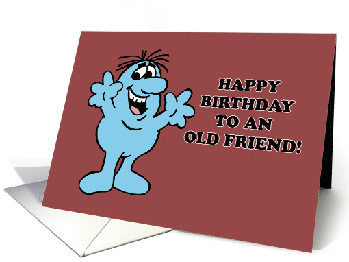 Humorous Birthday Card for a friend, with a cartoon character on a dark red background. The words say: Happy Birthday to an old friend! Inside says: Emphasis on old.
