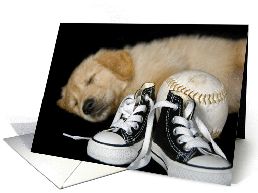 Sleeping golden retriever puppy with sport sneaker and softball for kid's birthday.