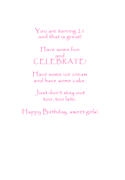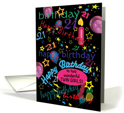 Give this colorful 21st birthday card to those special twin girls. The cover is filled with many text styles, balloons, stars, the number 21, and a pink lit candle. The background is black. The black headline is in an oval of dark pink. The inside message may be changed, if you wish. ©Gail Pepin