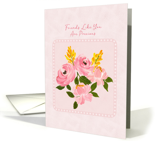 Celebrate the gift of friendship with this elegant floral friendship card featuring soft watercolor-style blooms. The cover features a bouquet of blush pink roses, accented with vibrant yellow blossoms and lush green leaves, framed by a dotted border for a charming touch. The handwritten script “Friends Like You Are Precious” adds warmth and sincerity. This card blends modern floral illustration with timeless elegance. Ideal for anyone who wants to remind a special friend how treasured they are.