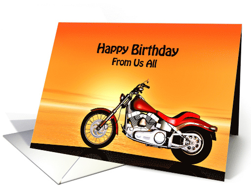 A great birthday card for to send from us all to someone who loves bikes. A motorbike standing by the sea with a glorious orange sunset. A great birthday card for anybody who likes biking and motorcycles.