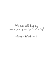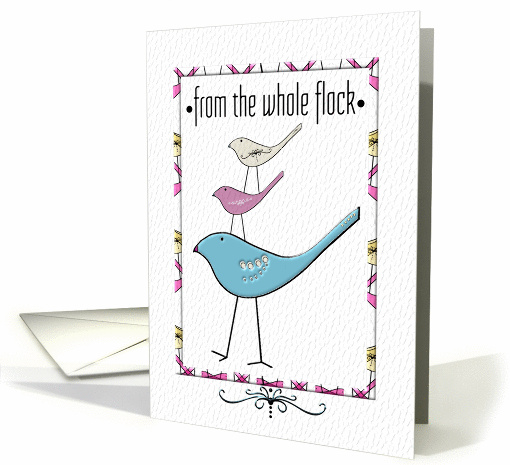 This design of a pyramid of birds is meant to be given by a group to say Happy Birthday from the whole flock.Colorful stacked birds are framed and set on a textured white background,Original design by Betsy Bush of Birthday Cards Cafe'.