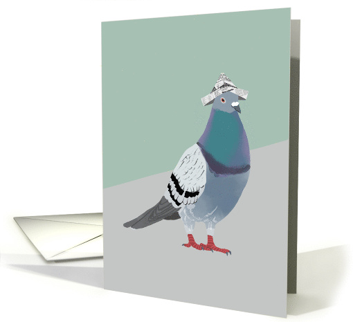 A sweet pigeon proudly shows off its newspaper hat. This charming pigeon announcement card is the perfect way to share some news with your friends and loved ones.
