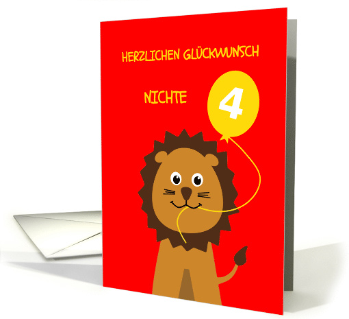 A yellow birthday balloon, a happy lion, and a bright red background - a german language card to make your niece smile. The greeting is in yellow to match the balloon: "Herzlichen Glückwunsch Nichte" = "Happy birthday niece". You can use the suggested message inside, or write your own: "Alles Liebe zum 4. Geburtstag" = "With love on your 4th birthday".