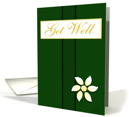 Get well card in gold over green background with a white and yellow flower in the lower right corner. A classy way to wish someone well.