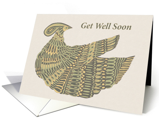 DINESH BIRD, named for the East Indian Lord of the Day, appears in an Art Nouveau-inspired color scheme with an intricate brown line set against plumage of muted greens and tan. With a matching green script and a light parchment background, he serves as an elegant messenger for your greetings.