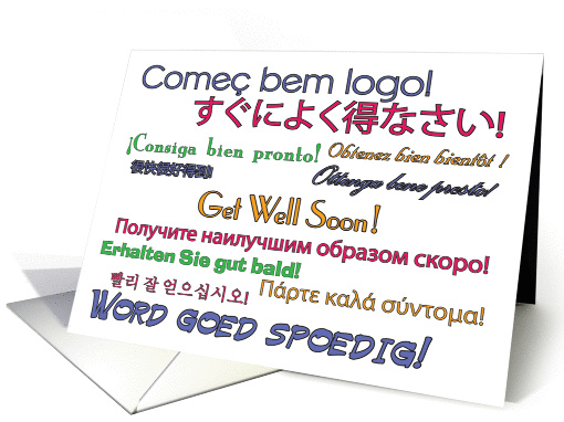 A bright and colorful get well card that says Get Well Soon in such languages as French, Dutch, Italian and more!