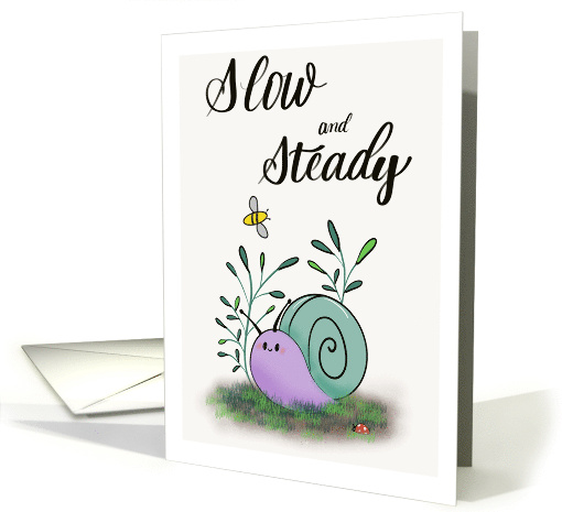 Send a gentle reminder that perseverance pays off with this charming greeting card featuring a sweet, smiling snail nestled in a whimsical garden. With the phrase "Slow and Steady..." beautifully lettered above, this card is perfect for encouragement, motivation, or simply brightening someone’s day. Whether they're facing a big challenge or taking baby steps toward a goal, this adorable illustration—complete with a buzzing bee, leafy plants, and a tiny ladybug—will warm their heart.