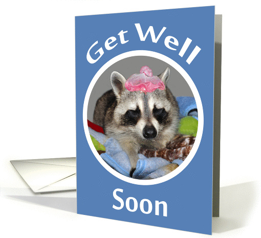 Let someone know you care with a humorous get well soon card featuring an adorable sleeping raccoon (Bullwinkle) wearing a night cap laying in colorful blankets in a white circle frame. Background is a pretty blue with white text. Inside like all GCU cards can be personalized by you if you wish to give it your own personal touch.