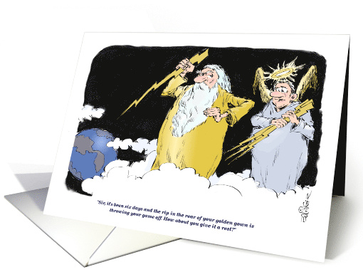 Our cartoon God is a hard-working being. He'd going to take a rest and the survivor who almost met their maker should rest, relax and take it easy also. Let's avoid those lightening bolts.