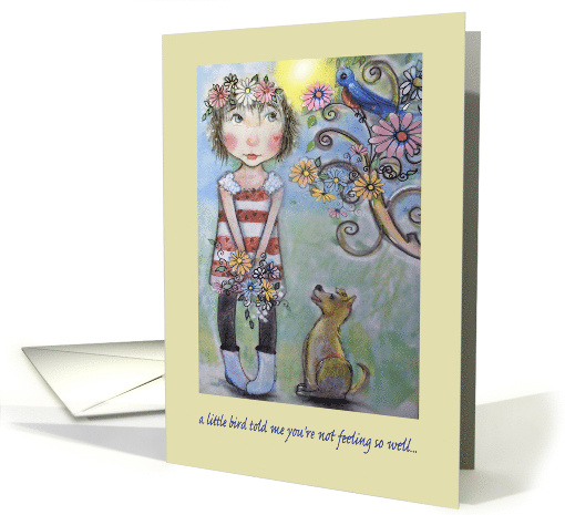 showing a cute little girl and her dog, listening to a blue bird in a tree that someones' not feeling that well. A delightful way of sending a get well message.