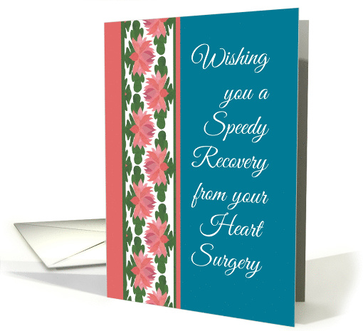 A pretty pink and blue Get Well Card for someone undergoing Heart Surgery, with a border of Water Lilies, from a hand-painted paper collage by Judy Adamson. The front cover greeting, 'Wishing you a speedy recovery from your heart surgery' is in white lettering on a teal background. You can edit or delete the inside message if you wish.