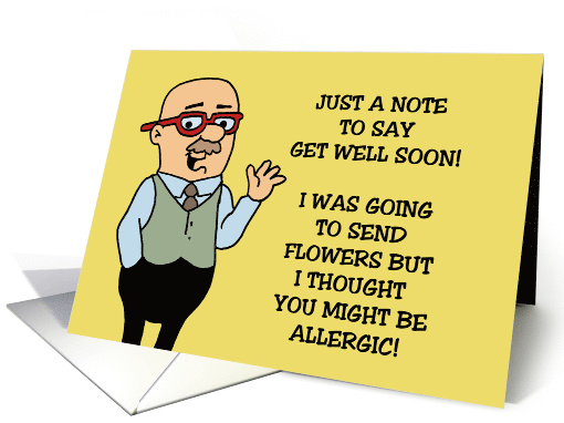 Humorous Get Well/Feel Better Card with a male cartoon character on a yellow background. The words say: Just a note to say get well soon! I was going to send flowers but I thought you might be allergic! Inside says: And I'm cheap!
