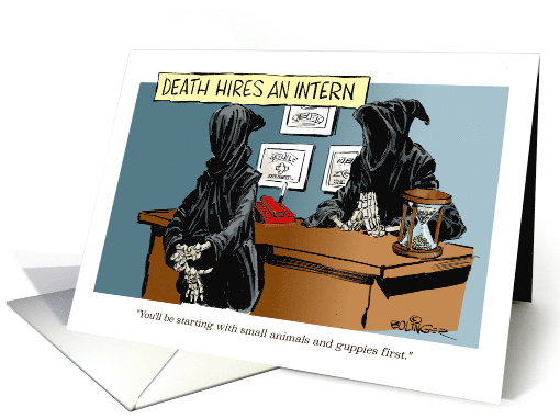 The card is a get well for your friend's pet dog. The cartoon shows Death Senior at his desk, instructing his new intern about what duties he'll be taking over.