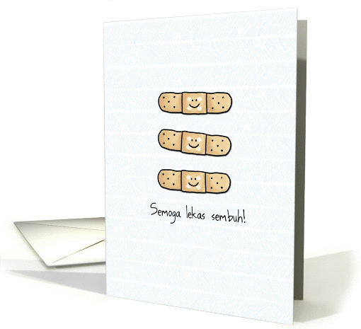 3 smiling kawaii (= cute) adhesive bandages stacked on top of each other in the center of this Indonesian Get Well card. Semoga lekas sembuh! = Get Well Soon in Indonesian