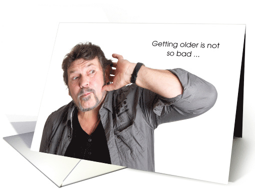 A fun getting older card with a middle aged man holding his hand to his ear to hear better on a sollid background.