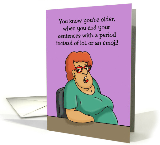 Humorous Getting Older Birthday card with a cartoon woman. The words say: You know you're getting older when you end your sentences with a period instead of lol or an emoji. Inside says Happy Birthday