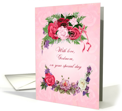 This birthday card for a godmom has beautiful roses in full bloom. The pink background has pale pink roses showing through. A gorgeous, traditional birthday card that will give real joy.
