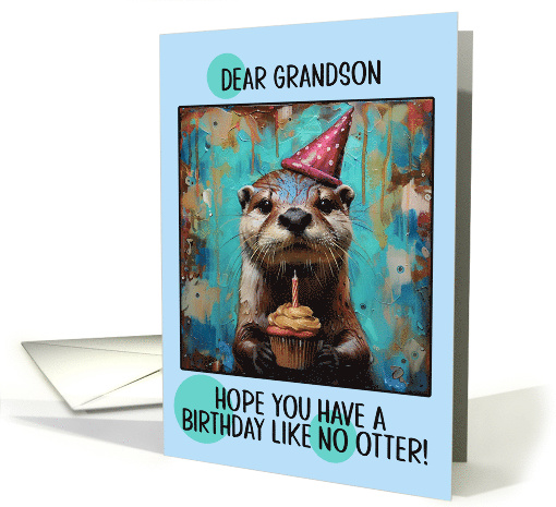 This delightful birthday card features a whimsical illustration of an adorable otter wearing a festive party hat and holding a delicious cupcake. The otter's fur is rendered with impressive detail, capturing its fuzzy texture and expressive eyes. The background is a vibrant, abstract swirl of blues, oranges, and browns, creating an underwater-like atmosphere filled with bubbles and splashes. The pun at the bottom, "Hope you have a birthday like no otter!" adds a playful, humorous touch that perfectly complements the charming otter illustration. A fun card to send to your wonderful grandson
