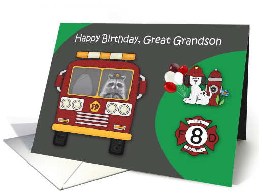 8th Birthday to Great Grandson Firefighter Theme with a Raccoon