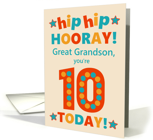 A bright and cheerful birthday card for your great grandson, with colourful lettering on a cream background. The front cover greeting is, 'hip hip HOORAY! Great Grandson, you're 10 TODAY!' . The red number 10 is extra-large and has big dots in golden yellow and a greenish blue. The inside message is just a suggestion and you can easily change it or delete it if you prefer something different or no printed inside message at all.
