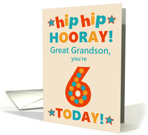A bright and cheerful birthday card for your great grandson, with colourful lettering on a cream background, The front cover greeting is, 'hip hip HOORAY! Great Grandson, you're 6 TODAY! The red number 6 is extra-large and has big dots in golden yellow and a greenish blue. The inside message is just a suggestion and you can easily change it or delete it if you prefer something different or no printed inside message at all.