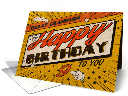 Your great grandson is sure to love this comic book style 9th birthday greeting featuring stars,word art,cloud,and sunburst lines, all with a vintage feel.