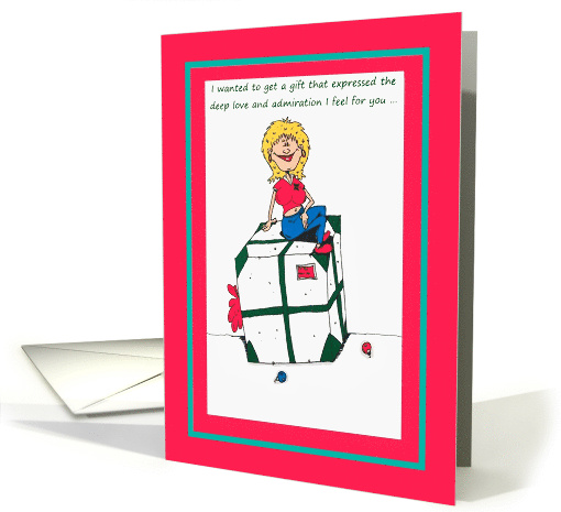 A sexy blonde lady sits on top of a giant Christmas package. She is wearing a red belly shirt, Blue jeans and has a big smile on her pretty face. This festive adult holiday card would be perfect for that naughty boy you know.