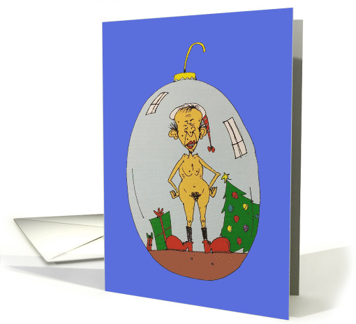 A naked man in a Santa hat is standing by a Christmas tree. Remember it's the little things! A comical Christmas card for that naughts elf this holiday