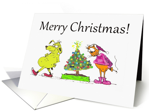 A dog walks away from what he thinks is a perfect Christmas tree. He has hung chew toys all over it, The cat thinks he's been boned. A funny Christmas card for your friend naughty or nice.