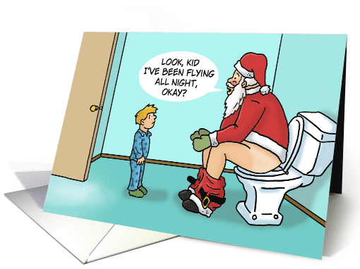 Funny Adult Christmas card with a cartoon Santa on the toilet talking to a kid who woke up. The words say: Look, kid I've been flying all night, okay? Inside says: Merry Christmas