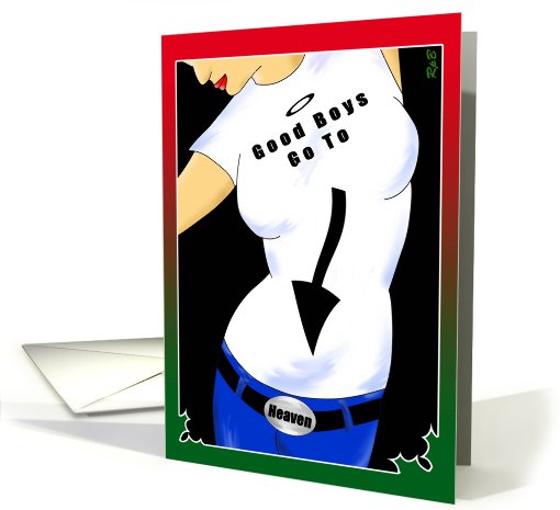 Sexy Girl wearing a T-shirt telling you where Good Boys Go. A fun/naughty way to send a holiday greeting. If they can let MILF cards go through...why not this?