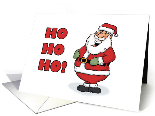 Humorous Adult Christmas card with Cartoon Santa on a white background. The words say: Ho Ho Ho! The inside says: I think I heard Santa calling your name!