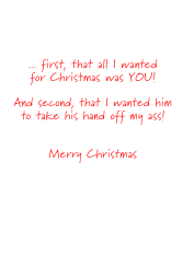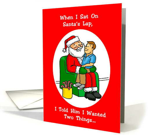 Christmas card showing cartoon of a man sitting on Santa's lap. Words say, When I Sat on Santa's lap, I Told Him I Wanted Two Things... Inside says, First that all I wanted for Christmas was you! And second that I wanted him to take his hand off my ass! Merry Christmas