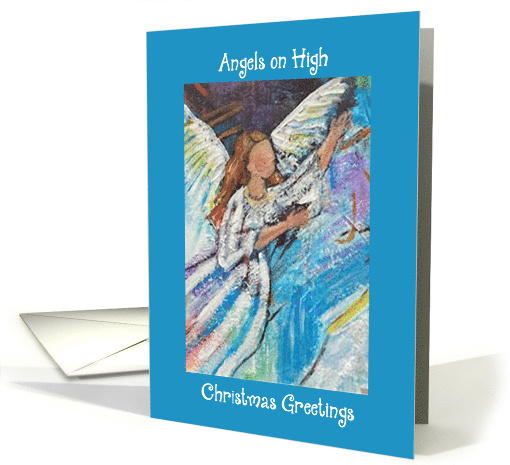 A handpainted angel on a blue background. The angel sits on an abstracted background. Angel sending Christmas Greetings.