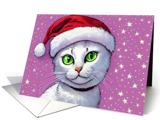 This beautiful holiday card would be a wonderful choice for the cat or animal lover in your life. The card depicts a white short-haired cat with big bright green eyes wearing a black collar and a red Santa hat. The background is pink with sparkling stars. @Deborah Roy.