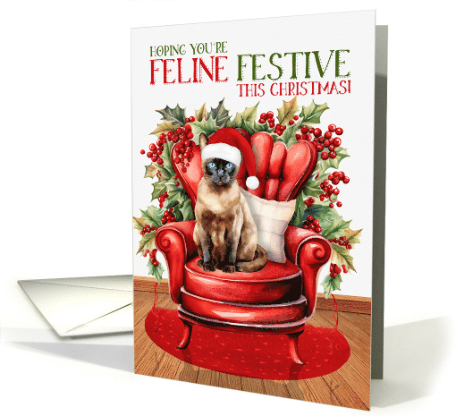 Holly leaves and big red berries decorate a comfy chair for this cute Seal Point Burmese cat in a hat to send feline-filled humor this holiday season.