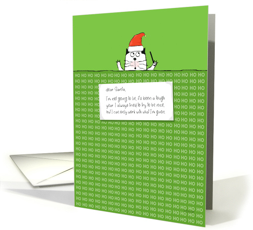It's not always easy being nice! The little cat in Santa hat explains this to Santa. Background of Ho Ho Ho. Christmas holiday card design for cat lovers. S. Fernleaf Designs.