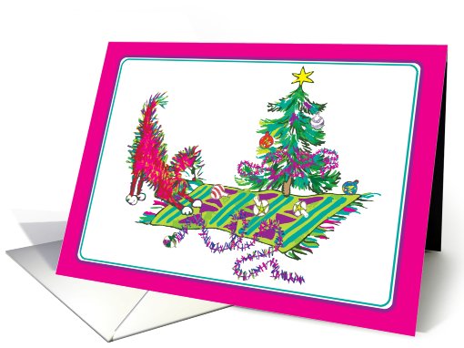 Christmas Humor, Cat on Rug with Christmas Tree, Illustration