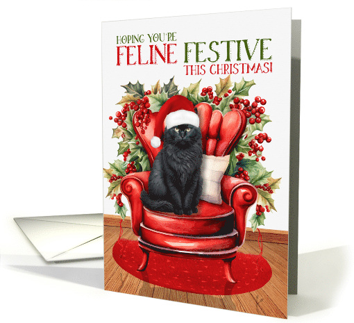 Fluffy Black Christmas Cat in a Santa Hat FELINE FESTIVE